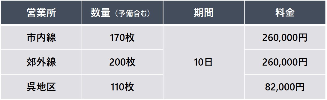 車両後部窓ガラスに掲出する帯状の広告で、歩行者やドライバーに対して繰り返し効果的な訴求ができます。