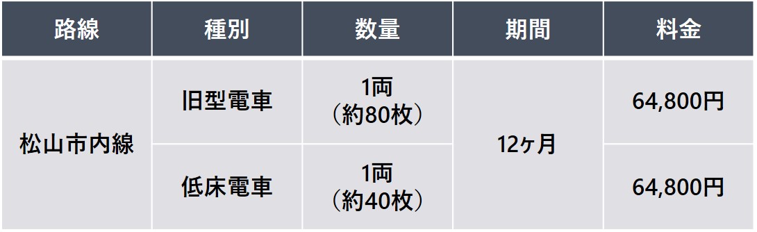 車両全体を特殊なシートでラッピングするインパクトの大きな広告。 路線を繰り返し運行することで強い印象を与え、高い広告効果が得られます。