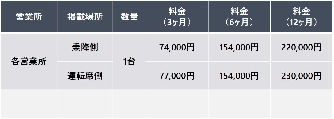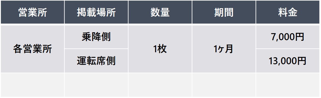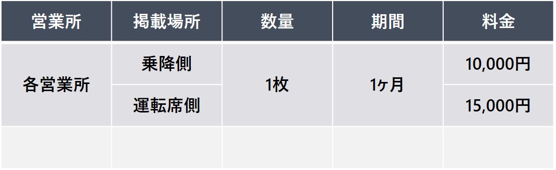 フルラッピングに比べリーズナブルで、短期間のキャンペーン展開などにも好評です。 また、複数台の掲出により広いエリアで効率的な広告効果が期待できます。