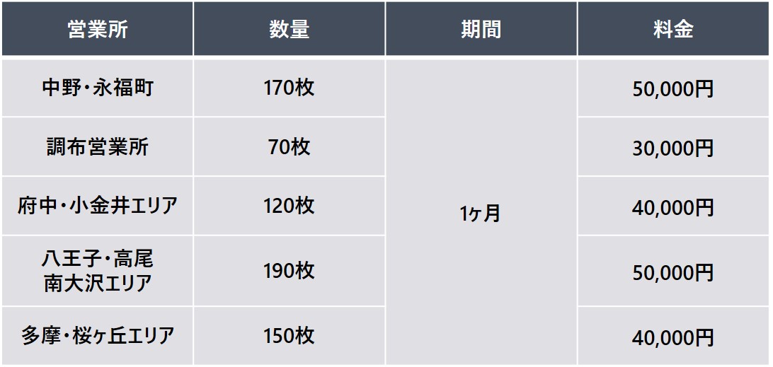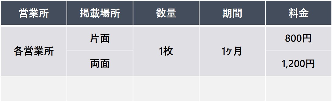 車内窓ガラスに掲出される広告です。 業務表記とタイアップすることにより、リーズナブルに注目度を高めることができます。