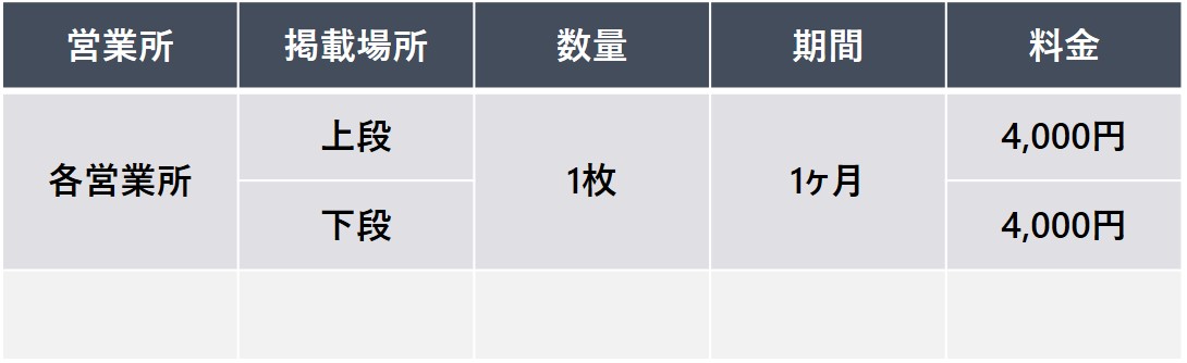 車内上部にポスターを掲出する広告媒体。 業務表記とタイアップすることにより、リーズナブルに注目度を高めることができます。