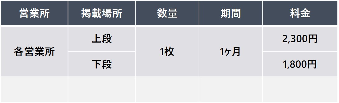 車内上部にポスターを掲出する広告媒体。 視認性に優れ、様々な業種のお客様に親しまれている媒体です。