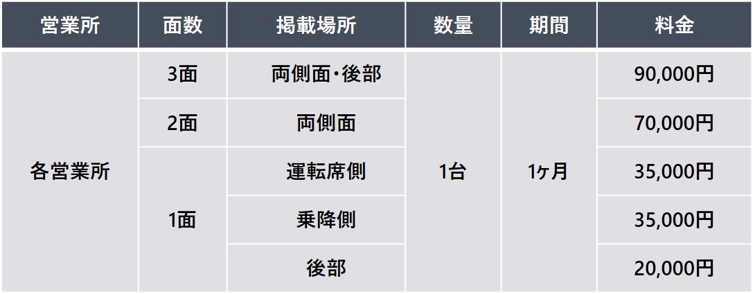 車体側面に掲出する広告。 歩行者やドライバーに対して繰り返し効果的な訴求ができます。