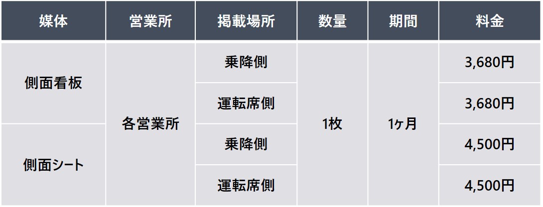 運転席側の車体側面に掲出する広告。 歩行者やドライバーに対して繰り返し効果的な訴求ができます。