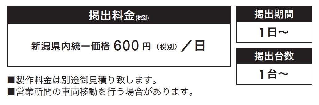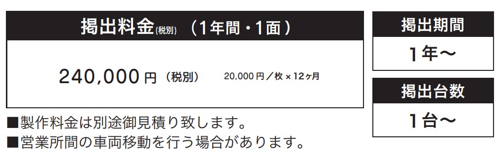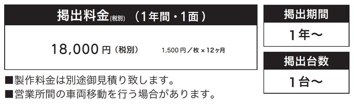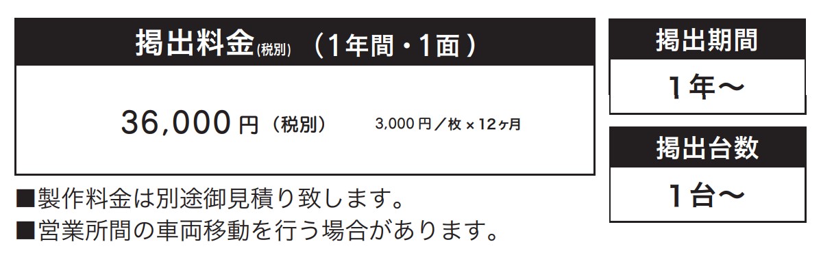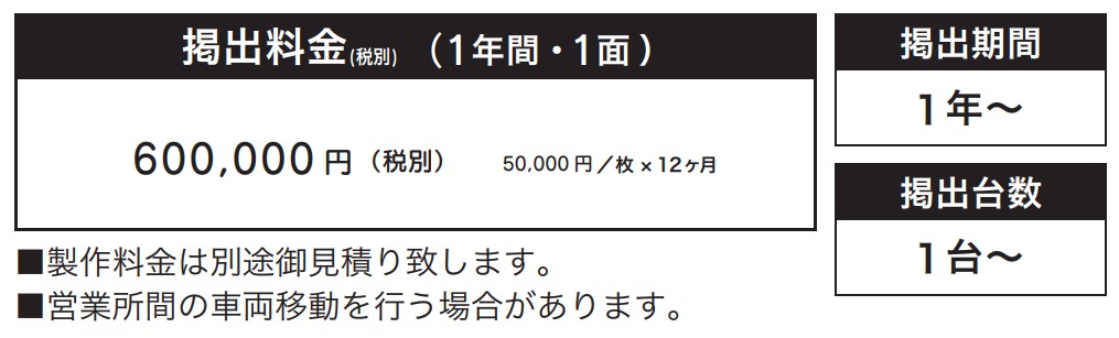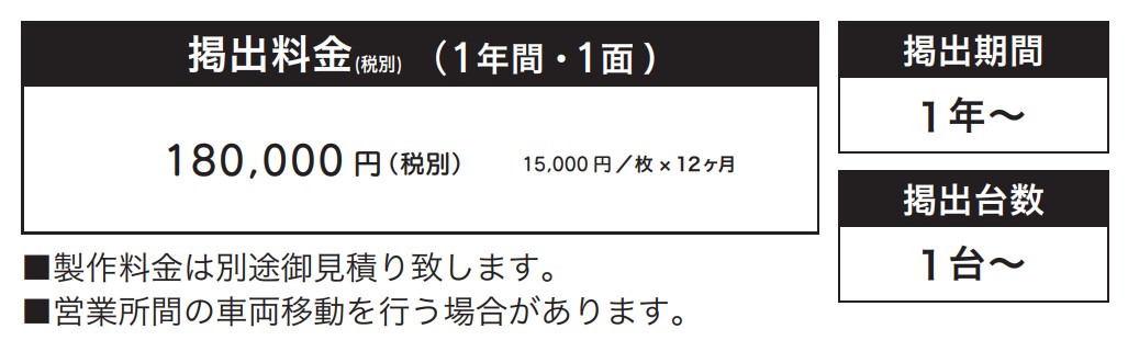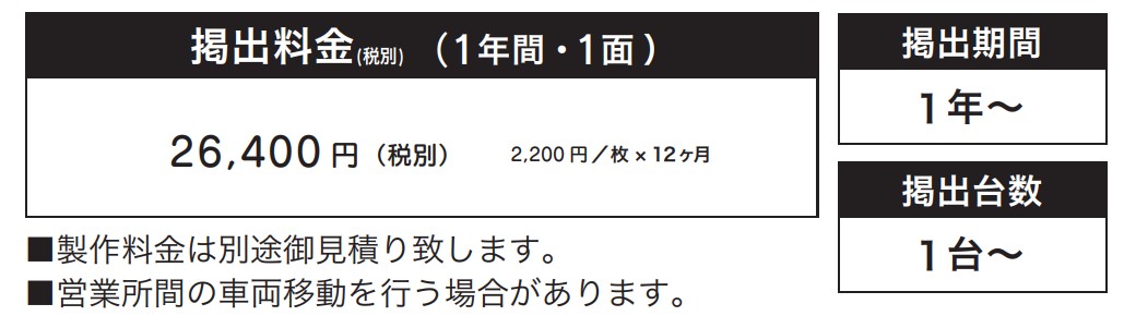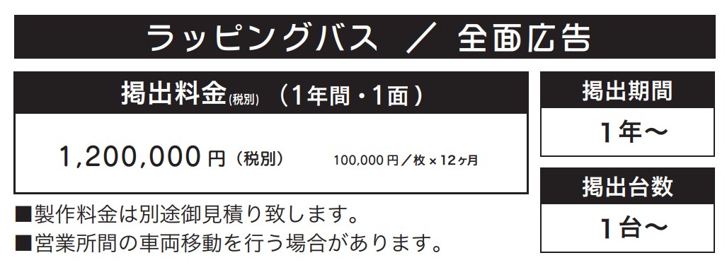 商品一覧 ラッピングバス / 全面広告 □ ご不明な点は、営業担当者にお問い合わせ下さい。ご用命の程、何卒宜しくお願い申し上げます。 ラッピングバス / 全面広告 バスワイド広告 □ ご不明な点は、営業担当者にお問い合わせ下さい。ご用命の程、何卒宜しくお願い申し上げます。 バスワイド広告 バス一面マルチ広告 □ ご不明な点は、営業担当者にお問い合わせ下さい。ご用命の程、何卒宜しくお願い申し上げます。 バス一面マルチ広告 バス側板大広告 □ ご不明な点は、営業担当者にお問い合わせ下さい。ご用命の程、何卒宜しくお願い申し上げます。 バス側板大広告 バス側板小広告 □ ご不明な点は、営業担当者にお問い合わせ下さい。ご用命の程、何卒宜しくお願い申し上げます。 バス側板小広告 バス戸袋広告 □ ご不明な点は、営業担当者にお問い合わせ下さい。ご用命の程、何卒宜しくお願い申し上げます。 バス戸袋広告 バス後部板広告 □ ご不明な点は、営業担当者にお問い合わせ下さい。ご用命の程、何卒宜しくお願い申し上げます。 バス後部板広告 バス後部ステッカー広告 □ ご不明な点は、営業担当者にお問い合わせ下さい。ご用命の程、何卒宜しくお願い申し上げます。 バス後部ステッカー広告 バスゼッケン広告 □ ご不明な点は、営業担当者にお問い合わせ下さい。ご用命の程、何卒宜しくお願い申し上げます。 バスゼッケン広告 バス後部マルチ広告 □ ご不明な点は、営業担当者にお問い合わせ下さい。ご用命の程、何卒宜しくお願い申し上げます。 バス後部マルチ広告 路線バス車内ポスター / 車内広告 □ ご不明な点は、営業担当者にお問い合わせ下さい。ご用命の程、何卒宜しくお願い申し上げます。 路線バス車内ポスター / 車内広告 バス側部ステッカー広告 □ ご不明な点は、営業担当者にお問い合わせ下さい。ご用命の程、何卒宜しくお願い申し上げます。 バス側部ステッカー広告 路線バス天吊り広告 / 車内広告 □ ご不明な点は、営業担当者にお問い合わせ下さい。ご用命の程、何卒宜しくお願い申し上げます。 路線バス天吊り広告 / 車内広告