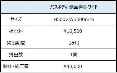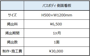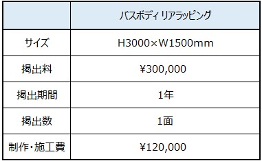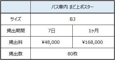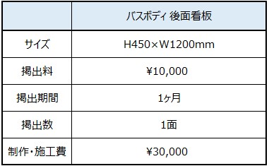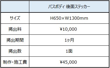 ドライバーからの視認性が最も高いバス後面を使用した媒体です。後面の中央部分に表示しますので見やすく、また価格も抑え加減なので大変使いやすく、複数台展開も適した媒体です。