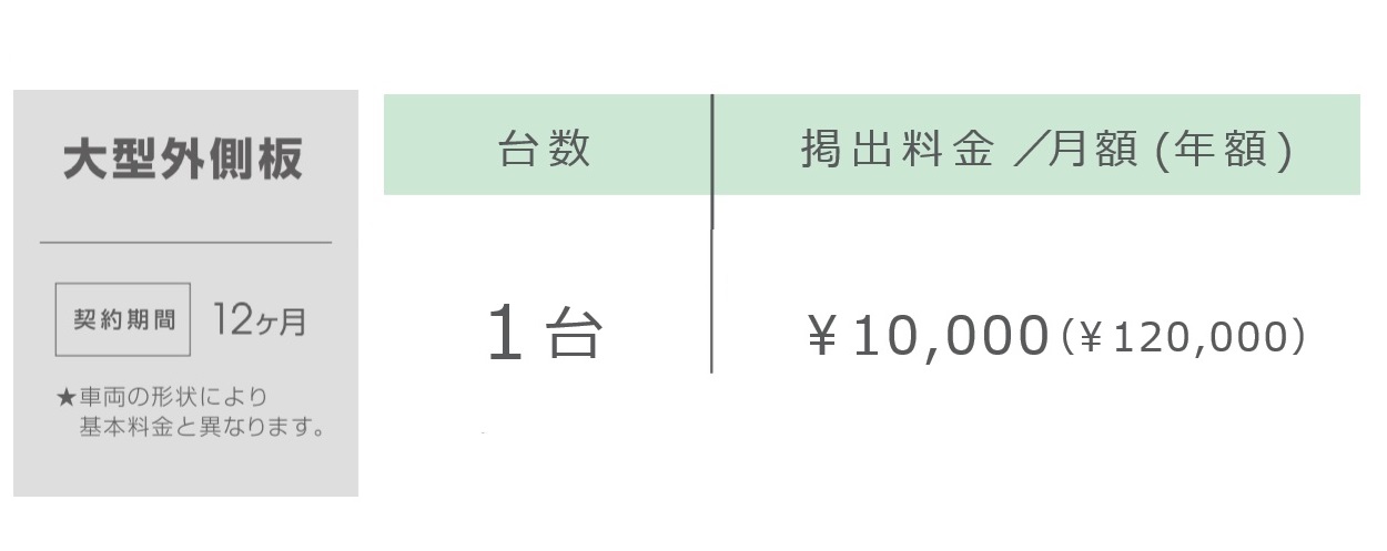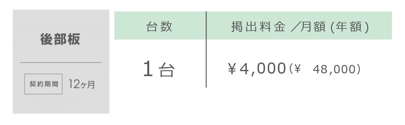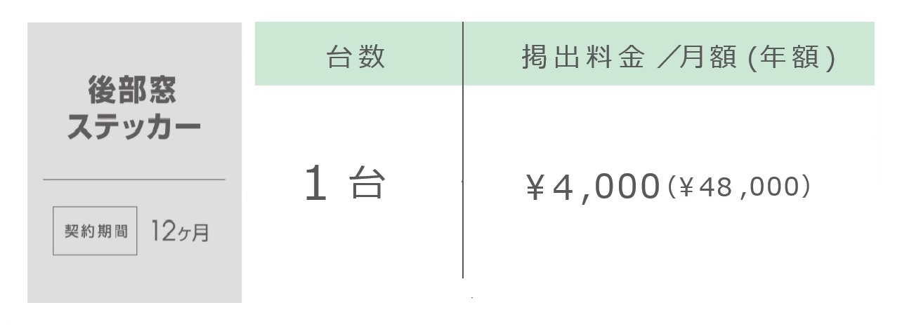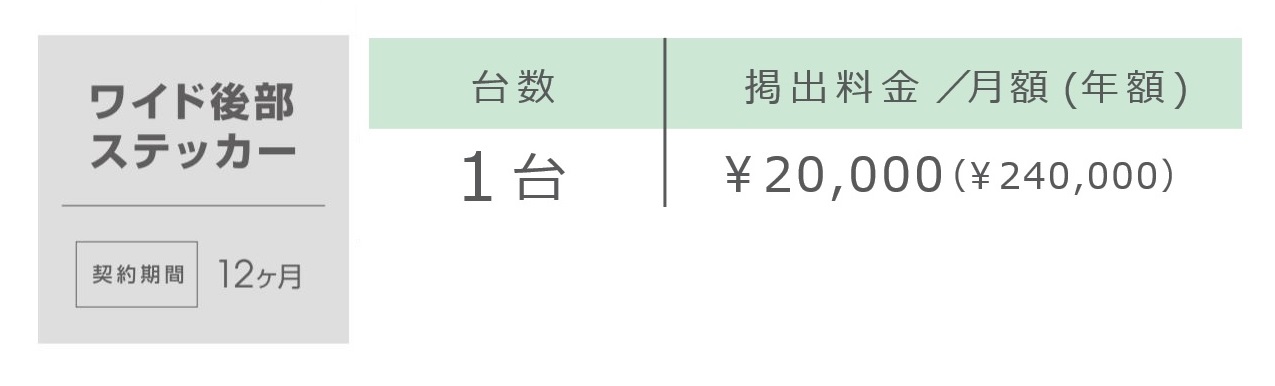 ワイド後部ステッカーは後続車のドライバーなどに繰り返し訴求します。 また、お値段もリーズナブルで長期契約されることが多く、複数台数で掲出しやすい人気の広告媒体です。