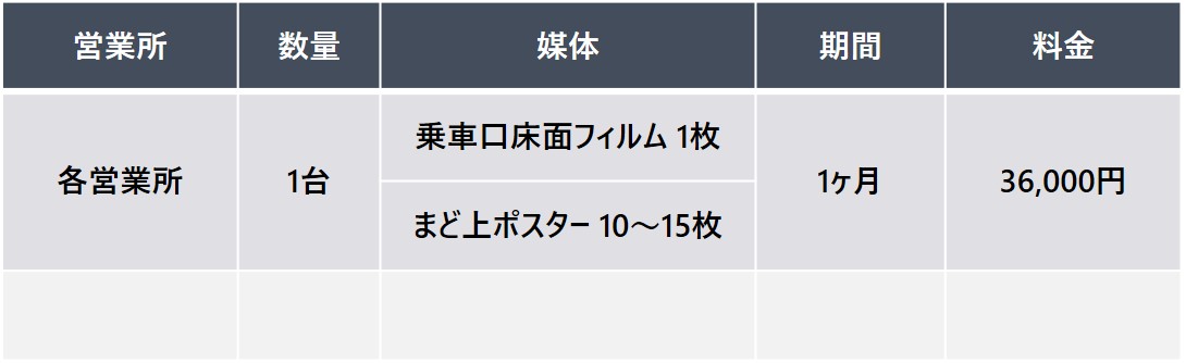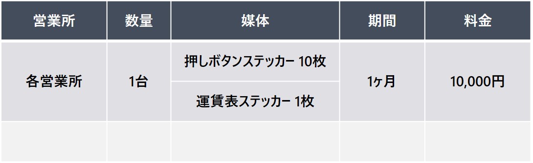 押しボタンと運賃表の広告をセットにした企画です。 降車の際に必ず目に留まる場所のため、高い視認率が期待できます。