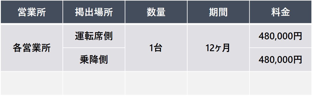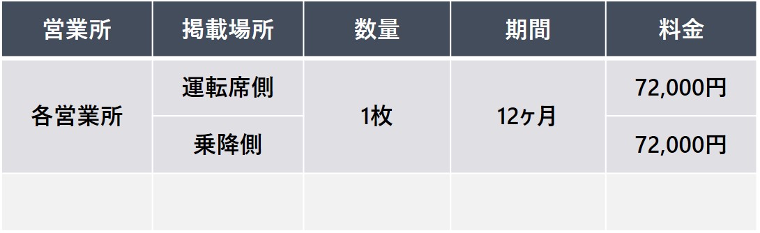 フルラッピングに比べ、リーズナブルにインパクトの大きい広告を掲出できる媒体。 複数台の掲出により広いエリアで効率的な広告効果が期待できます。。
