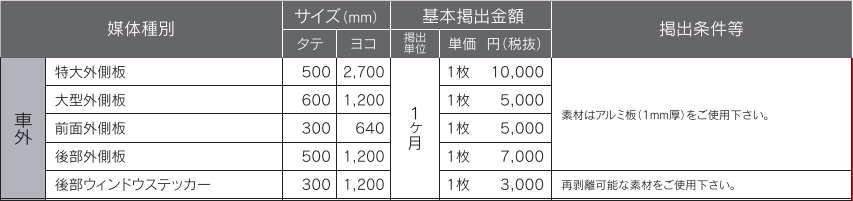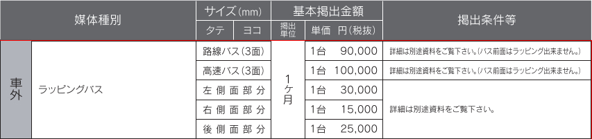 九州産交バス 熊本県民の皆様の足として、熊本県内のほぼ全域をカバーする路線バスネットワークを展開しています。 また九州都市間バスや空港リムジンバスで、九州主要都市や熊本空港をダイレクトに結びます。 メディアガイドPDFダウンロード PR 商品一覧 ラッピングバス 熊本の路線バス、熊本からの九州主要都市間バス、熊本から熊本空港へのリムジンバスのバスラッピング。 ※九州産交バスの運行は、1車両1路線の固定運行方式ではありません。 各営業所管轄の路線であれば不定期に運行いたしますので、路線指定としてはお受けできません。 ※車両の選定は弊社にご一任いただきます。 ※広告掲出に関しては、九州産交バスの広告掲載基準に基づきます。 ラッピングバスはこちら 外側板・後部ウィンドウステッカー 熊本の路線バス、熊本からの九州主要都市間バスの車外広告。 外側板の掲出には1mm厚のアルミ板をご使用ください。 外側板等はこちら 車内ポスター 熊本の路線バス、熊本からの九州主要都市間バスの車内広告。 ポスターには、良質な用紙をご使用ください。 車内媒体はこちら