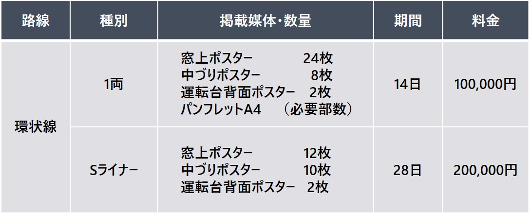 車両全体を特殊なシートでラッピングするインパクトの大きな広告。 路線を繰り返し運行することで強い印象を与え、高い広告効果が得られます。