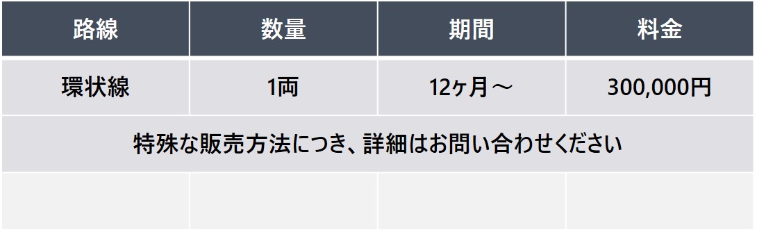 低床車両の車両全体を特殊なシートでラッピングするインパクトの大きな広告。 路線を繰り返し運行することで強い印象を与え、高い広告効果が得られます。