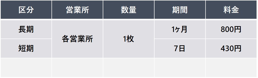 【申込単位】 長期 : 1枚単位 / 3ヶ月以上 / 営業所指定可能