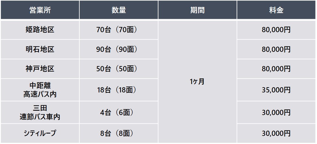 フルラッピングに比べ、リーズナブルにインパクトの大きい広告を掲出できる媒体。 複数台の掲出により広いエリアで効率的な広告効果が期待できます。