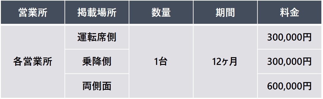 フルラッピングに比べ、リーズナブルにインパクトの大きい広告を掲出できる媒体。 複数台の掲出により広いエリアで効率的な広告効果が期待できます。