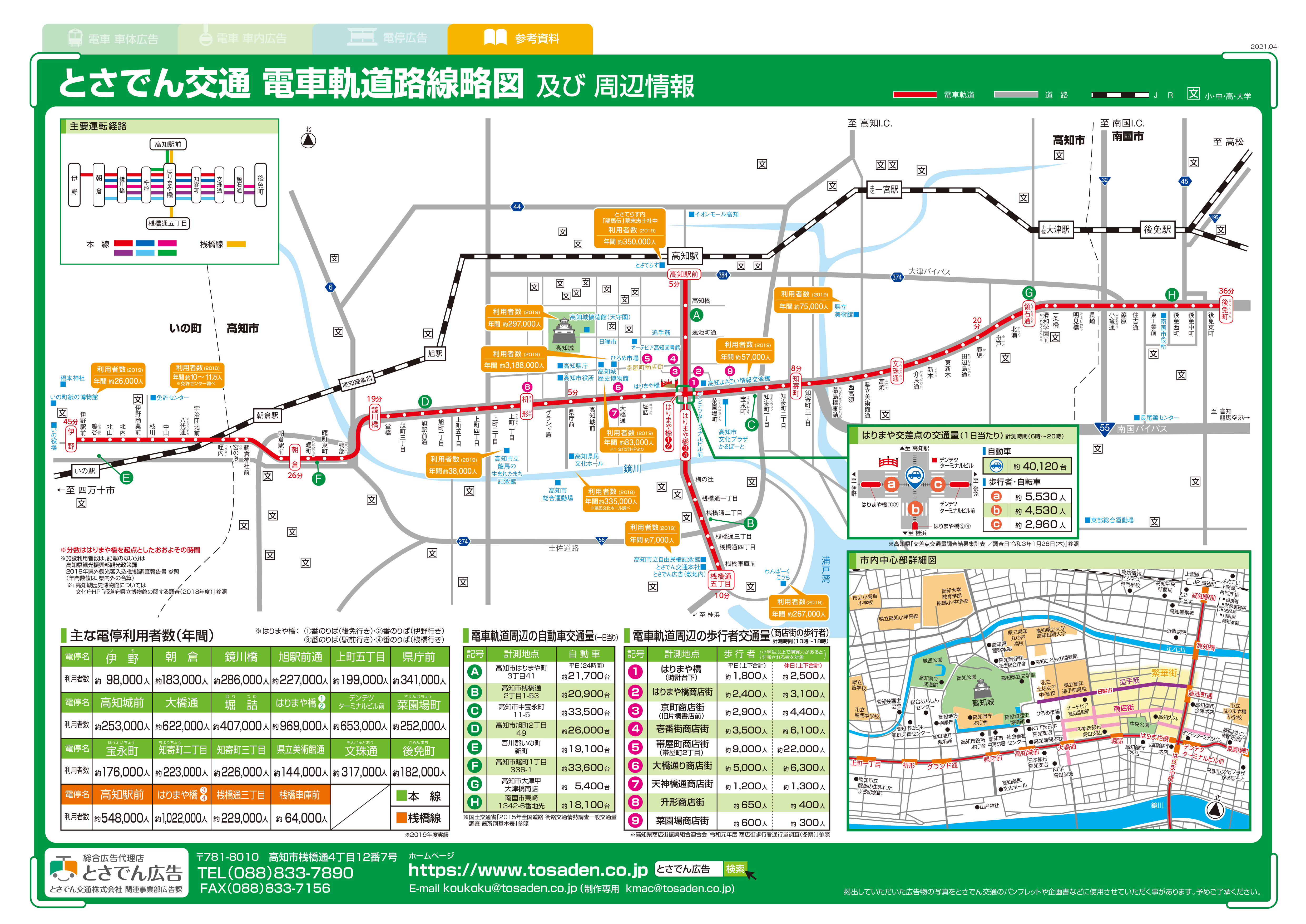 四国・高知県の交通広告 とさでん 高知県で最も人口密度の高い高知市を中心に広がる運行路線周辺には、 観光・文化・商業施設などが点在しており、交通量も多いため注目度が高く広告効果が期待できます。 メディアガイドPDFダウンロード PR 商品一覧 とさでん 電車広告 高知県中心部を運行する、【とさでん】の車体・車内・電停広告 ※デザイン・製作費・復元費は別途お見積り致します。お問い合せください。 ※ポスターは予備枚数として、総数の20%を別にご用意ください。 各種媒体はこちら インフォメーション