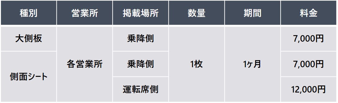 車体側面に掲出する広告。 歩行者やドライバーに対して繰り返し効果的な訴求ができます。